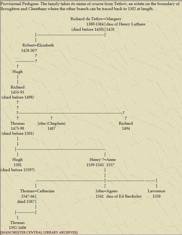 1315c | Amabel Radclyffe married Adam de Tetlow. Annabella Radclyffe married Jordan de Tetlow, their son Jordan married Alice, daughter of Thomas Prestwich and had a daughter and heiress Joan who married to Richard Langley C1347-1365. Edmund Radclyffe married Anne, eldest of three daughters of Edmund Tetlow of Coldhurst.